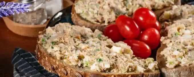Yksinkertainen, maukas välipalavaihtoehto, joka on valmistettu leivästä, kalasäilykkeistä ja vihanneksista.